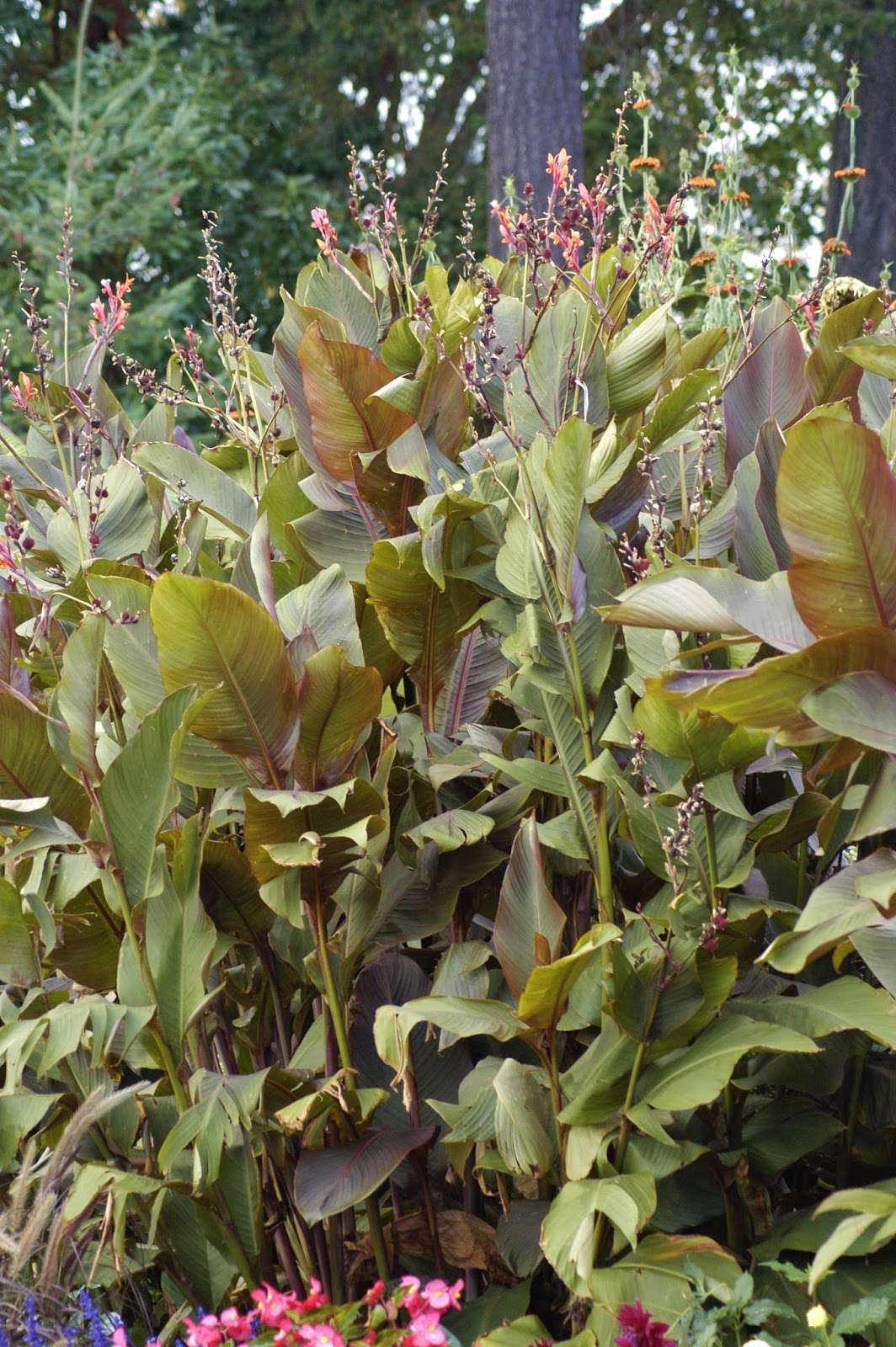 Time to add to our list of big, colorful, in-your-face, tropical-looking plants. Canna lillies, or just cannas, feature dramatic, colorful foliage and vibrantly colored flowers, available in shades of pink, red, orange, yellow, white as well as some bi-color varieties. These blooms are large and somewhat disorganized-looking, and are held above the foliage starting in mid-summer and lasting well into the fall. The foliage choices are as varied as the flowers, maybe even more so. Selections include green-leaved forms (such as the top photo), plus maroon-, bronze-, striped, and multi-colored ones. The leaves are all large and lance-shaped.