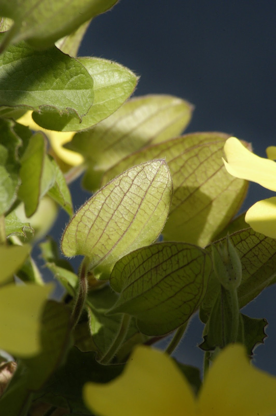 This cheery looking climber is frequently seen in hanging baskets and summer blooming pots. Bright green foliage sprawls to 8ft (2.4m) tall and wide, and is covered with vivid yellow, five petaled flowers with a dark, purplish-brown or black throat. These blooms are between 1 and 1.5 in across (2.5-3.75cm), and the perfectly round centers are in such dark contrast to the brilliant petals that they look bottomless. (It’s a bit creepy, actually… but that could just be me.) The faded flowers give way to interesting-looking seed pods; see the 3rd photo. Other varieties with differently-colored blooms are also available.
