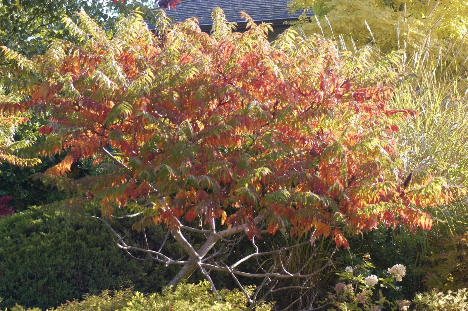 This North American native is an upright growing small tree or large shrub that will reach 10ft (3m) tall, occasionally as much as 20ft (6m) high, and will spread to form large patches by suckering if it’s allowed to. Huge leaves are divided into 11-23 toothed, slim leaflets, which are about 2-5in (5-12.5cm) long each. These are bright green above, whitish underneath. Early summer flowers give rise to attractive reddish fruit clusters in the autumn that stays with the bare branches throughout the winter. But the selling point for me is the brilliant fall display of color. The leaves change from green to brilliant scarlet, and go through every other color on the way. Make sure to remove those suckers when they appear to keep its spreading habit in check.
