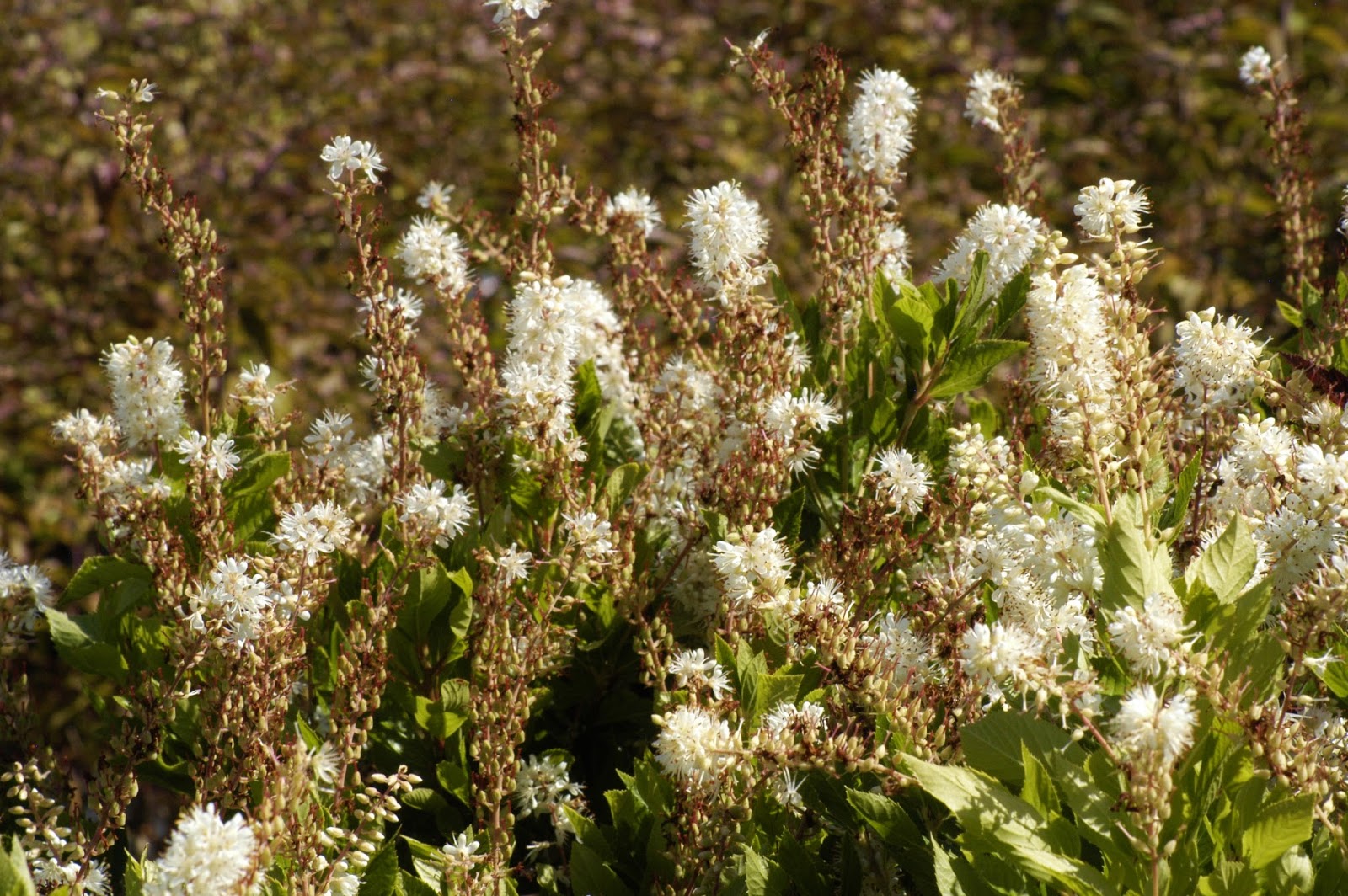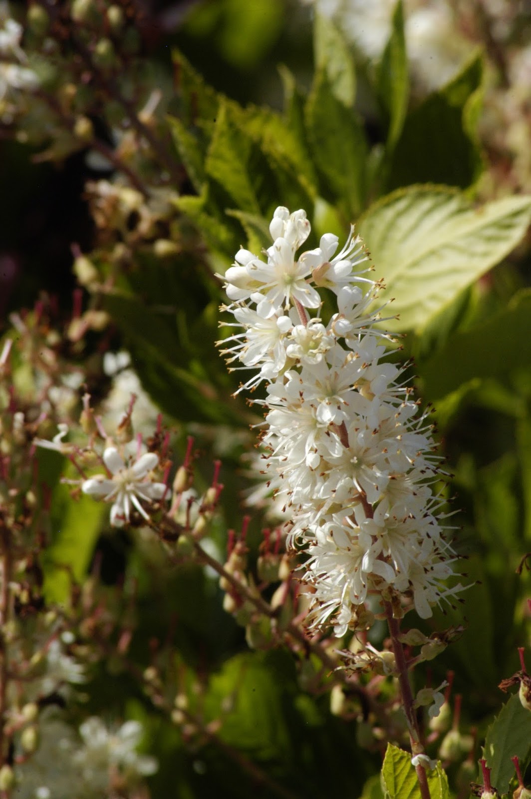Grown mostly for its irresistible fragrance, this compact variety of an old favorite tends to grow wider than it does high. At 3ft (90cm) high and 4ft (1.2m) wide it is rounded and densely branched, with glossy toothed leaves that turn yellow in fall. Sweetly fragrant spikes of small white flowers that can reach 6in (15cm) long appear in mid to late summer. These in turn form brown seed capsules, that can last into winter. Taller varieties, as well as an evergreen one, are also available.