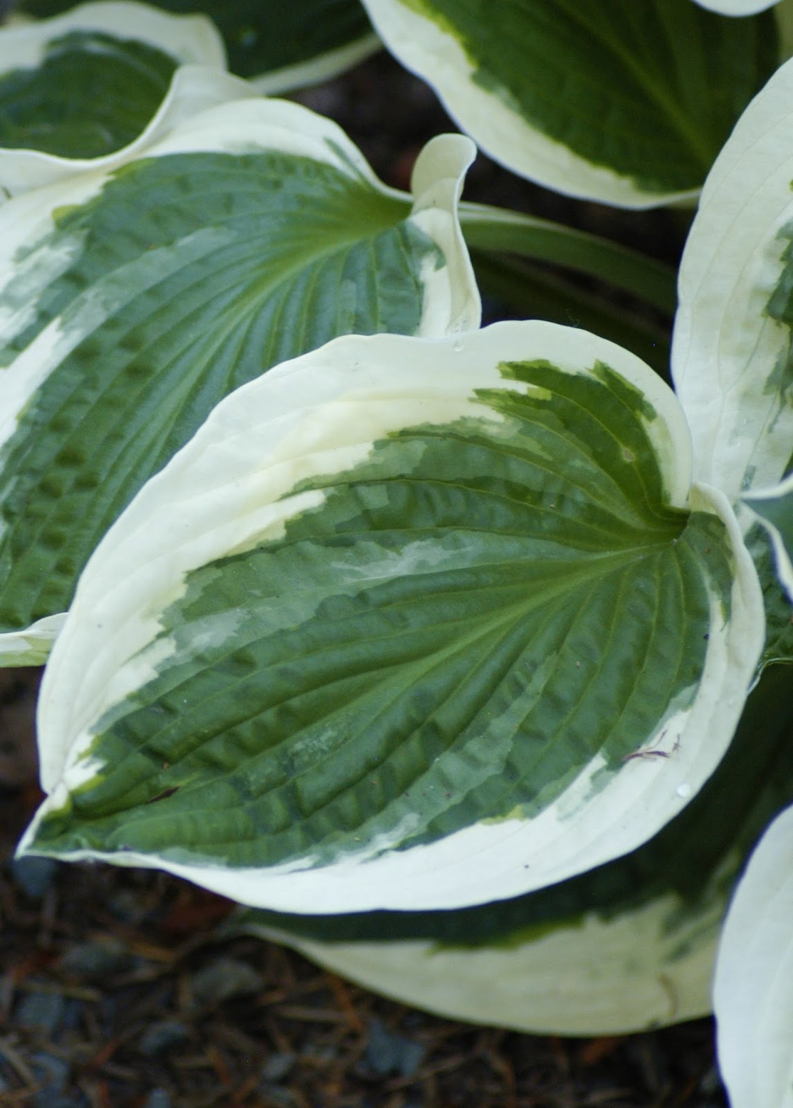 This is one of my favorite Hostas. One of these will light up a shady spot under a rhodo or pieris, and in a group they are showstopping. Growing to (40cm) high by 3 ft (90cm) wide, it forms a clump of oval, slightly crinkly, upward-cupped leaves that have many subtle shades of green in the center, surrounded by a wide cream to pure white variegation on the margins. The tall (30in or 75cm) purple flowers that appear in summer are more a bonus than an attraction; the foliage is the real star here. This will die to the ground each winter, just to repeat its show the following spring. It looks great in containers.