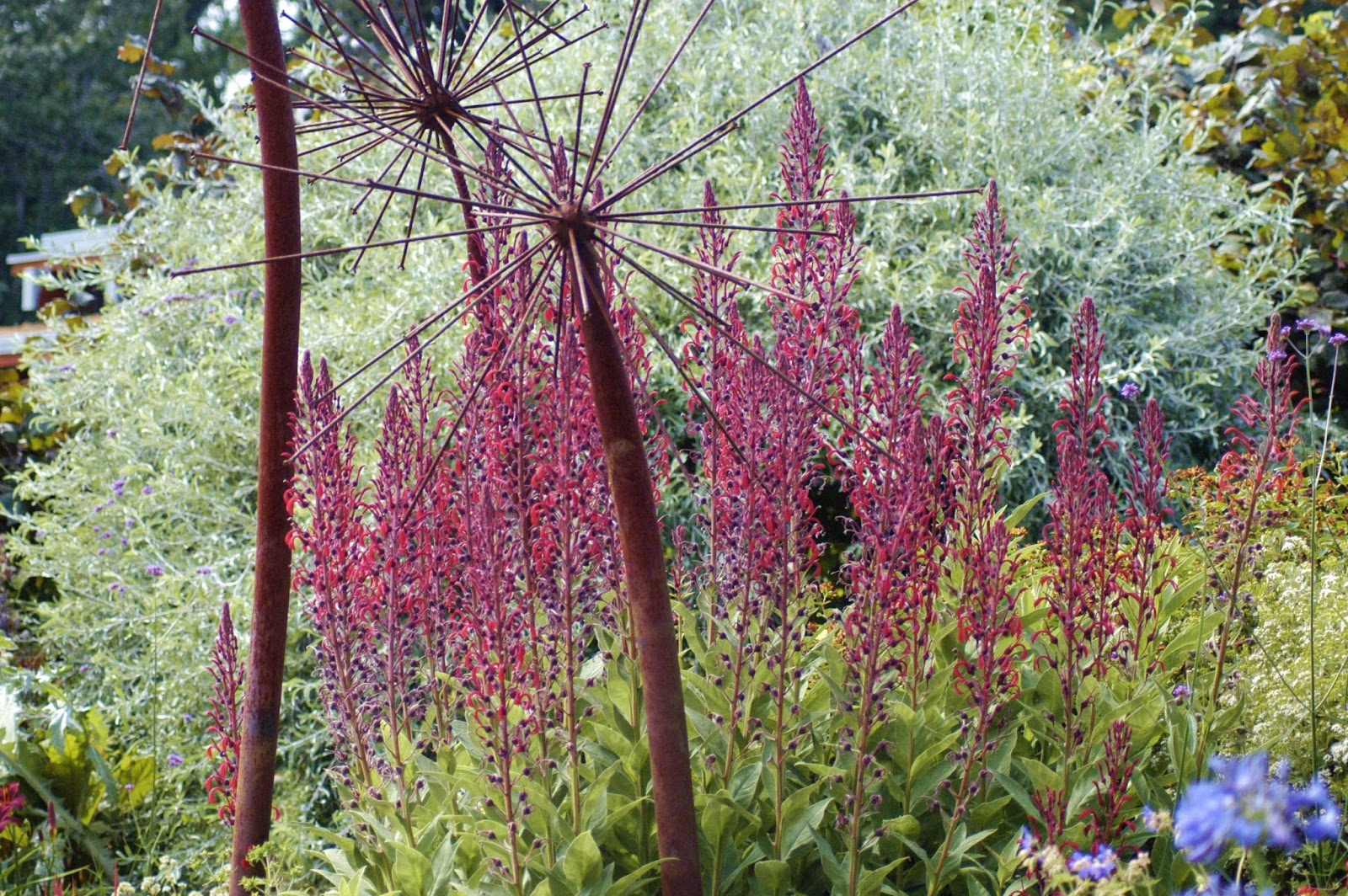 This bold Chilean native forms a 4ft (1.2m) wide clump of robust, lance-shaped felty leaves, each reaching up to a foot (30cm) long, held by reddish stems. In mid to late summer, tubular bright red flowers are arranged in spires at the top of each stem, and can reach 6-8ft (1.8-2.4m) high. These flowers form an interesting pattern, often right at eye level, that adds to the overall tropical, structural feel of this impressive perennial. It attracts hummingbirds, I’m told.